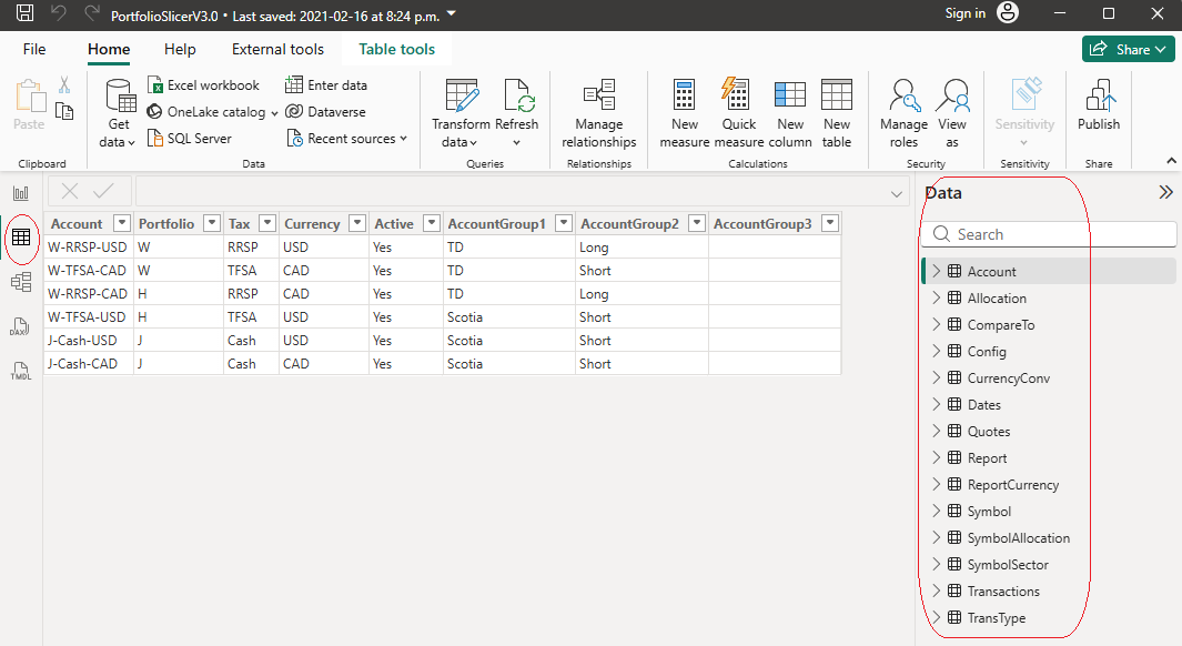The Portfolio Slicer Power BI file contains tables that are loaded from the files for Portfolio Slicer reports
