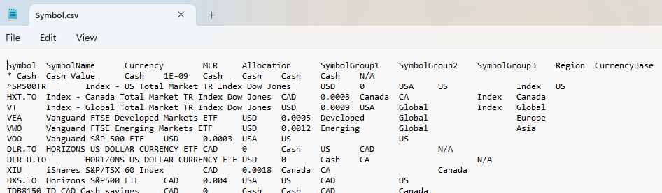 Symbol.csv Overview Symbol.csv contains the list of all symbols, or investments, used by Portfolio Slicer.
